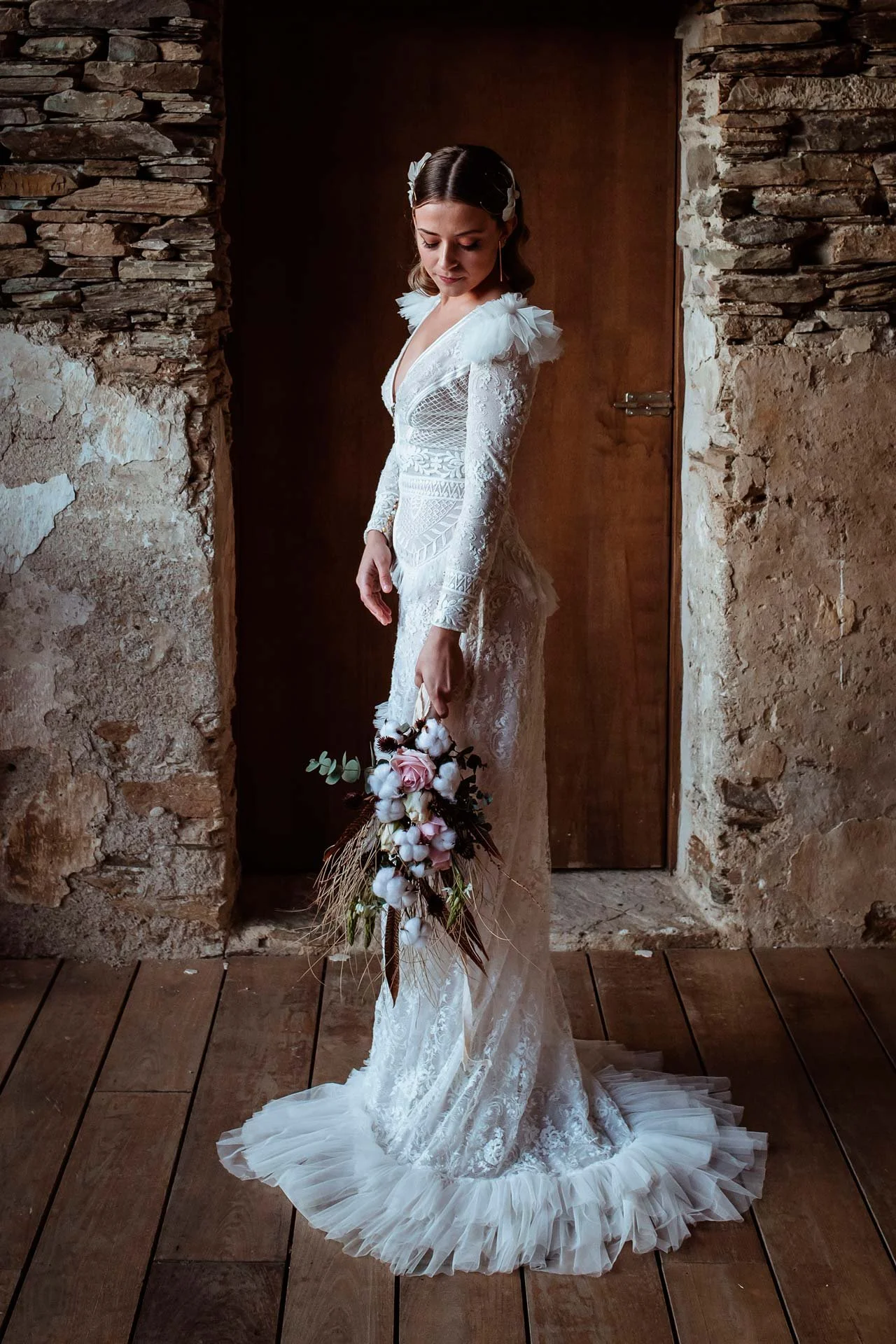 En el Pazo de Tovar, creamos unas imágenes preciosas en un entorno único en la provincia de Lugo, vistiendo a María con un vestido espectacular de Sara Lage, que encajaba a la perfección con la decoración de La Guinda del Pastel y Verdenaz Floral.